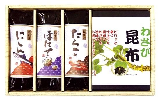 ●内容量:にしん昆布巻150g×1本、ほたて昆布巻150g×1本、たらこ昆布巻150g×1本、わさび昆布180g