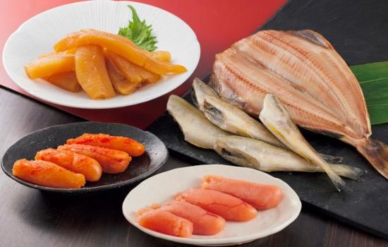 ●内容量:味付数の子(黒大折)鰹だし味300g、しまほっけ開き×1、干しこまい200g、無着色辛子明太子(切子)120g、無着色たらこ(切子)120g