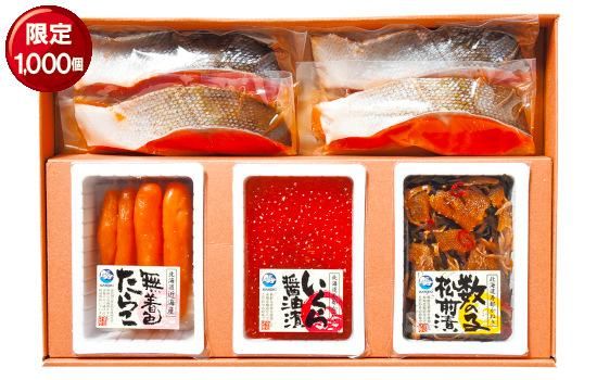 ●内容量:塩紅鮭切身70g×4切、近海無着色たらこ120g、いくら醤油漬100g、数の子松前漬100g