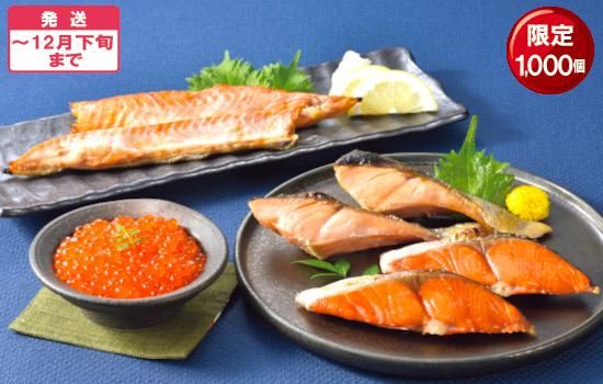 しっとりとした脂乗りの紅鮭、コクのある上品な薄味のいくら醤油漬など人気の鮭製品の詰め合わせ。