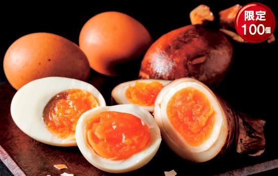 アスタキサンチンを含む卵を使用した、しっとりとした黄身の燻製卵と、いかの中に卵を入れ醤油ベースのタレで煮込んだいかたまらんのセットです。