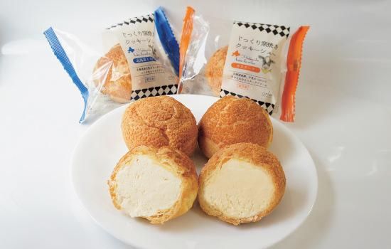 北海道産小麦を使用したクッキー生地のシュー皮に北海道産牛乳を使用したなめらかなカスタードクリームとコクのあるミルククリームをそれぞれたっぷりつめこみました。
