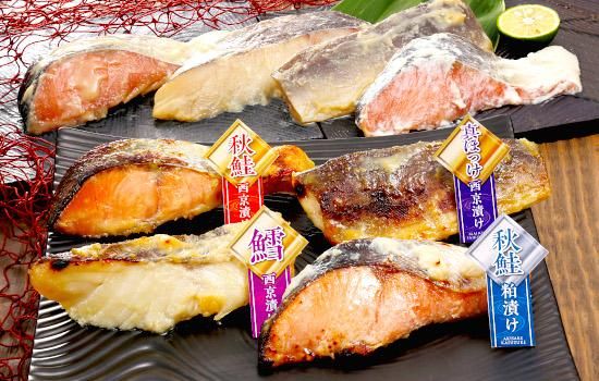 ●内容量:秋鮭西京漬70g×2切、秋鮭粕漬70g×2切、真だら西京漬70g×2切、真ほっけ西京漬60g×2切
