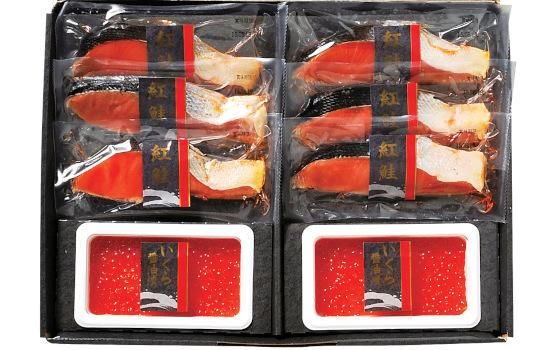 流し網漁で漁獲されたロシア産紅鮭と、北海道オホーツク海産のいくら正油漬をセットにしました。