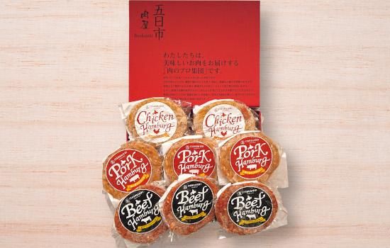 ●内容量:ビーフハンバーグ150g×3、ポークハンバーグ150g×3、チキンハンバーグ150g×2