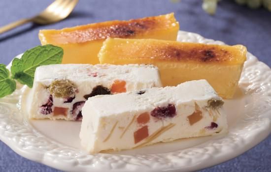 ジャージー牛乳を使用した冷凍プリン「カタラーナ」、クリームチーズにドライフルーツやナッツを散りばめたアイスチーズケーキ「カッサータ」のスイーツセットです。